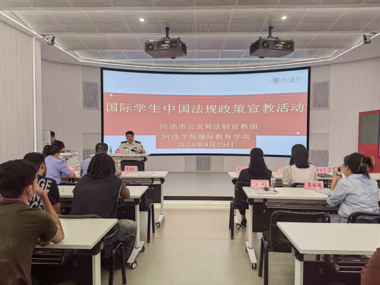 9月29日下午,公司邀请河池市公安局高校警务联络工作组开展国际员工中国法规政策宣教活动。河池市公安局韦世忠处长向国际员工开展普法宣传教育,让国际员工在从事个人宗教活动和网络行为时能够知法懂法守法。