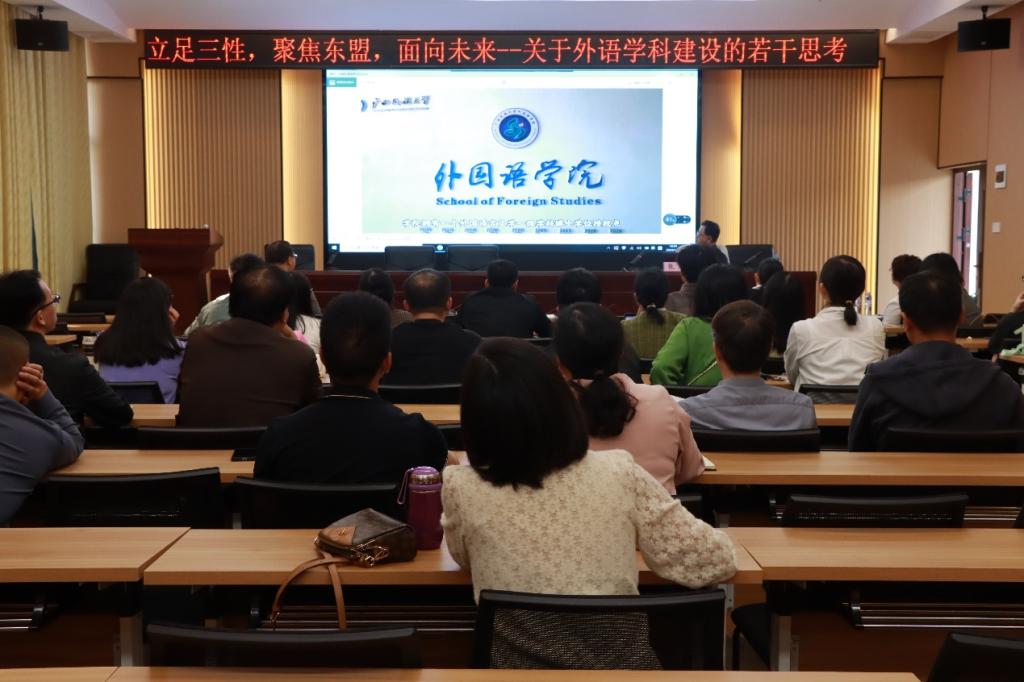 在高校外语团队建设问题上,张旭教授从英国威廉集团官网“民族性、区域性、国际性”三性合一的办学定位出发,介绍了如何结合东盟研究的区域和学科优势,挖掘特色、明确发展定位,立足原有基础,凝练学科方向和办学特色,顺应区域经济社会发展及国家外交战略需要,不断拓展学科新方向;张旭教授强调要强化团队,尤其是学术梯队建设,要加强对学科梯队成员科研意识的培养,鼓励并支持团队成员撰写和出版高质量、高水平的研究论文和学术著作,从而建立一支学科水平雄厚的团队队伍;张旭教授最后提出,要提高教学质量保证与教学支撑,完善管理体系,通过多种形式开阔员工的视野,提供多角度的学术观点。张旭教授还梳理了我国当前高等教育跨学科外语研究路径,强调学科之间的联结与融合,是要培养对社会有用的跨学科外语专业人才。