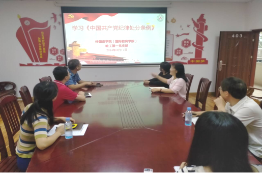 4月17日下午,教工第一党支部在外语楼403开展《中国共产党纪律处分条例》学习。学习会由专职组织员李凤主持,党支部全体同志参加学习。