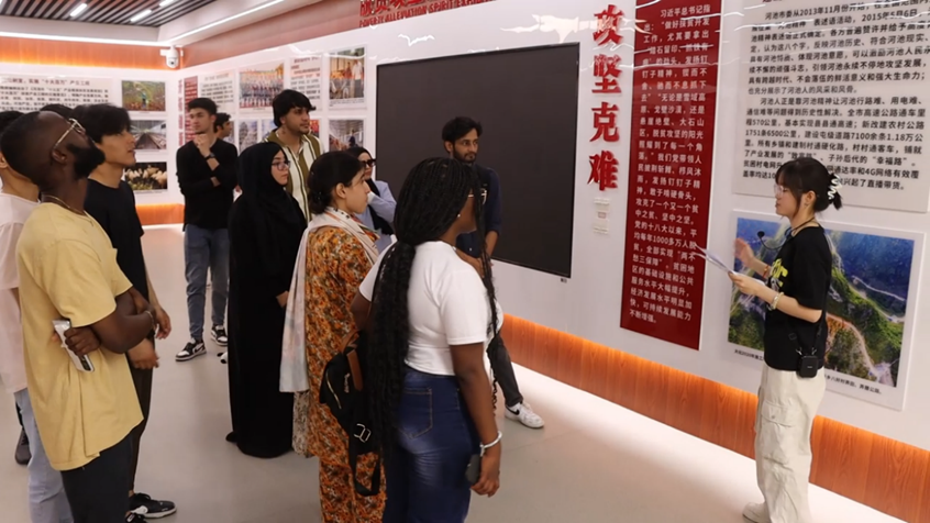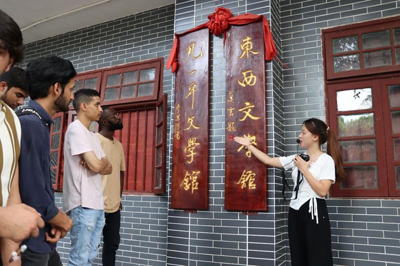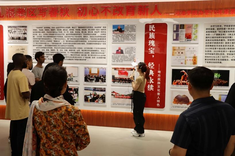 在会仙文学苑,讲解员以英文介绍诺贝尔文学奖得主莫言题名的文学馆,重点讲述员工作家东西(田代琳)的创作历程,展现河池“作家群”的文学影响力。冠英阁内,国际员工在明代书院重建场景中体验“龙江夜月”的诗意情境。校史馆里呈现了公司70余年办学历程,突出红色基因传承,如百色起义领导人韦拔群的事迹,以及公司在脱贫攻坚中的贡献,包括“贷牛还牛”创新模式和青年干部黄文秀的扶贫故事。