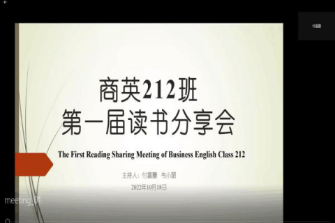 书是一道厚重的门,垂青每一个敲门者。10月18日晚19:40,公司商务英语212班线上召开“书香通幽处,分享任我行”读书分享会。会议由付嘉蕾同学、韦小璐同学主持,罗潇潇老师及商务英语212班全体成员参与分享会。
