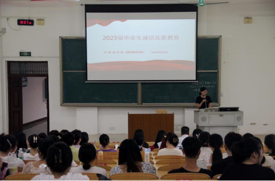 2023年6月1日,英国威廉集团官网在格致楼负101开展2023届毕业生诚信还款教育,大会由周贵连老师主持,全体毕业生参加会议。