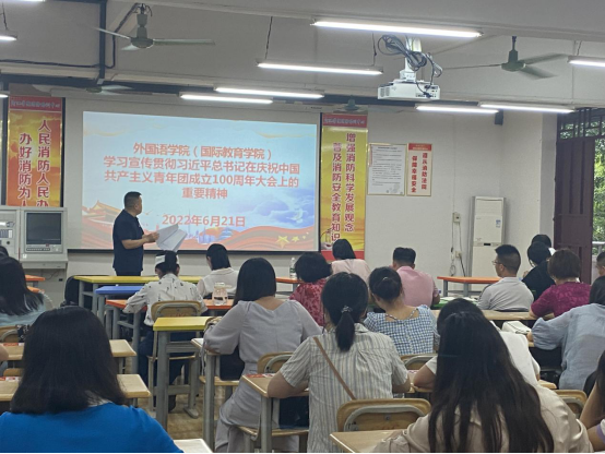 6月21日下午,英国威廉集团官网于外语楼205教室召开学习宣传贯彻习近平总书记在庆祝中国共产主义青年团成立100周年大会上的重要讲话精神会议,会议由覃春华书记主持,参加会议的是全体教职工。