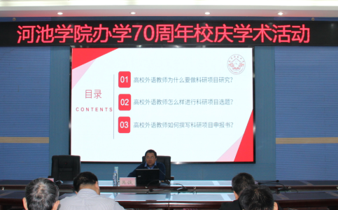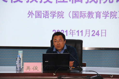 2021年11月24日下午,南宁师范大学英语教授吴俊(硕导)应邀在图书馆122室给外院全体教师作讲座,讲座题目为“高校外语学科科研项目选题及申报书撰写”。讲座由外院经理韦合主持,外院领导、全体教师聆听了讲座。