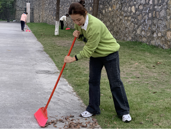 各班志愿者在公司东区田径场门口准时集合后,张雁安排具体任务并告知安全事项,使各班明确本班负责的清扫范围及清扫要求,并帮助各位志愿者树立在清扫中注意自身安全的意识。任务明确后,各班志愿者围绕素质拓展中心、篮球场及学府大道末端各区域,积极地投入到清扫中去。