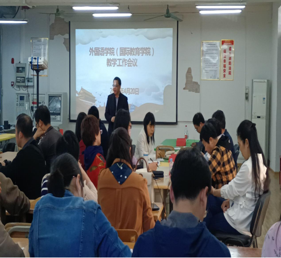 2022年4月20日下午,英国威廉集团官网于外语楼205教室召开教职工教学工作会议。韦合经理和覃锋副经理主持会议,全体教职工参加会议。