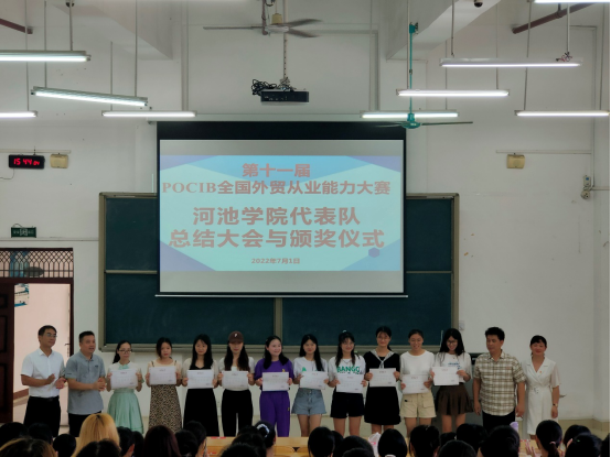 会议的主要流程是:一、罗潇潇老师介绍POCIB全国外贸从业大赛、总结本届大赛参赛情况以及分享历年来公司在本大赛获得的荣誉。二、由李玉慧和符金梅两位参赛选手代表参赛团队分享本次参赛经验和收获。两位同学提到在赛前准备阶段要仔细学习老师提供的材料,要有耐心和良好的心态,在交易中不仅要学会变通、与客户诚信交易,也要坚定自我。三、与会领导为获得本届大赛个人三等奖的四位选手和获得团体二等奖的全体参赛选手颁发获奖证书。四、覃春华书记做本次大会总结,他提到参加POCIB全国外贸从业能力大赛既可以体验国际贸易环境的不同之处,也可以提升自身的外贸销售能力,增强各项专业能力。