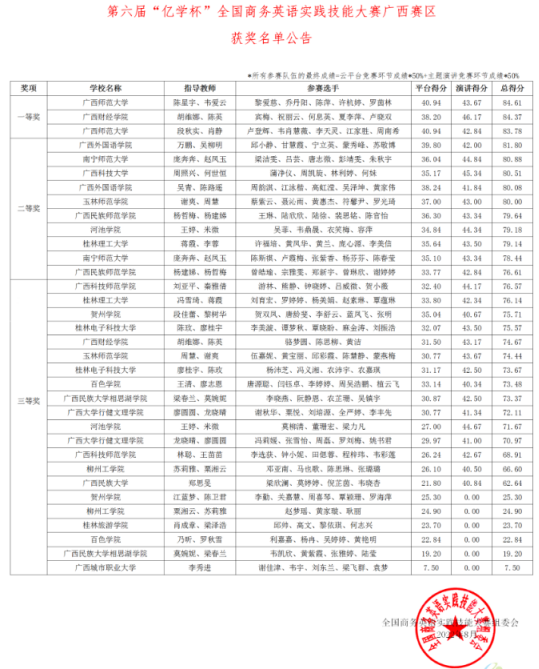 2022年8月,第六届“亿学杯”全国商务英语实践技能大赛广西赛区获奖名单揭晓,由英国威廉集团官网商务英语专业王婷、米微两位指导老师带领的参赛队伍皆获佳绩,其中吴菲、韦鼎晟、衣笑梅、容萍组成的团队荣获二等奖,莫柳清、董珊宏、梁力凡组成的团队荣获三等奖。