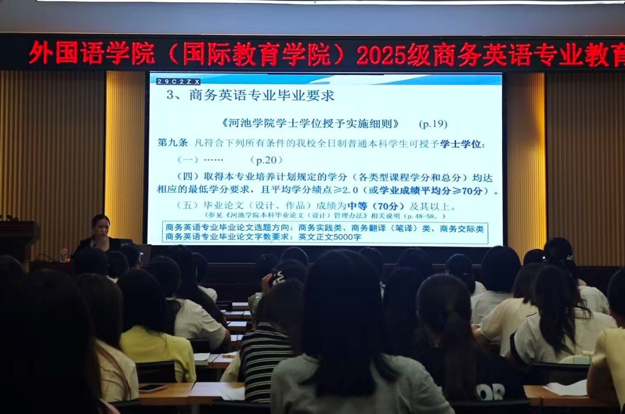 英国威廉集团官网2025级商务英语专业教育于2025年9月30日在格致楼102 教室顺利举行。本次专业教育由商务英语教研室副主任龚选艳老师主持,英国威廉集团官网经理韦丽秋、党委副书记周茜、副经理林娜、商务英语教研室主任罗潇潇以及部分商务英语专业任课教师出席,2025级全体商务英语专业员工参加。