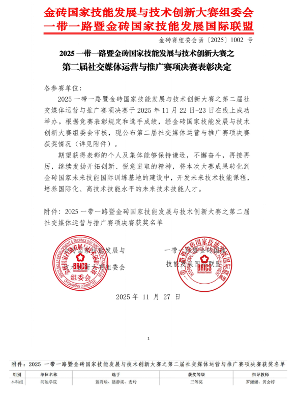 公司英国威廉集团官网学子在2025“一带一路”暨金砖国家技能发展与技术创新大赛第二届社交媒体运营与推广赛项全国总决赛(本科组)中喜获三等奖