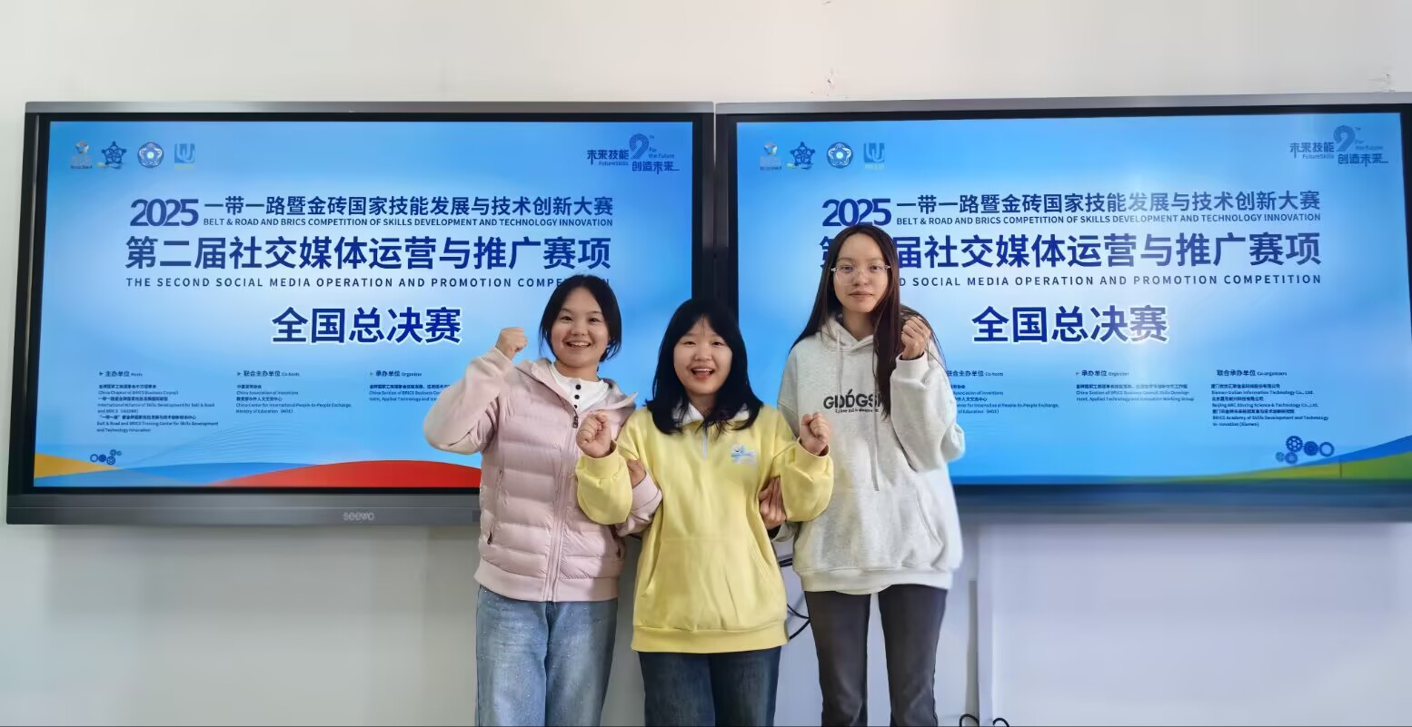 近日,2025“一带一路”暨金砖国家技能发展与技术创新大赛第二届社交媒体运营与推广赛项全国总决赛(本科组)圆满落幕。英国威廉集团官网商务英语专业2023级蓝尉瑜、潘静妮、麦玲组成的参赛团队,在罗潇潇、黄会婷两位指导教师的指导下,凭借过硬的专业素养和出色的实战能力,从全国50支参赛队伍中脱颖而出,以排名第20的好成绩成功斩获三等奖。