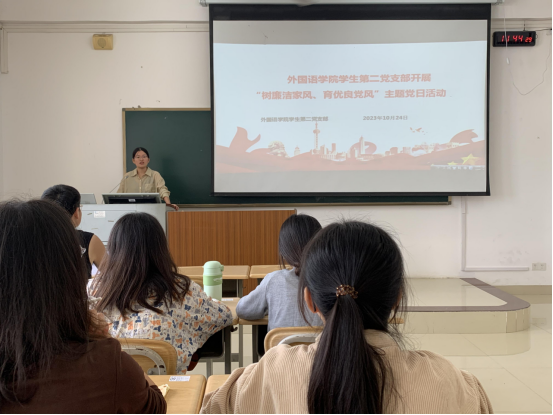 2023年10月24日中午,公司员工第二党支部在格致楼605开展以“树廉洁家风、育优良党风”为主题的党日活动。活动由党支部书记周贵连老师主持,第二党支部全体成员参与学习。