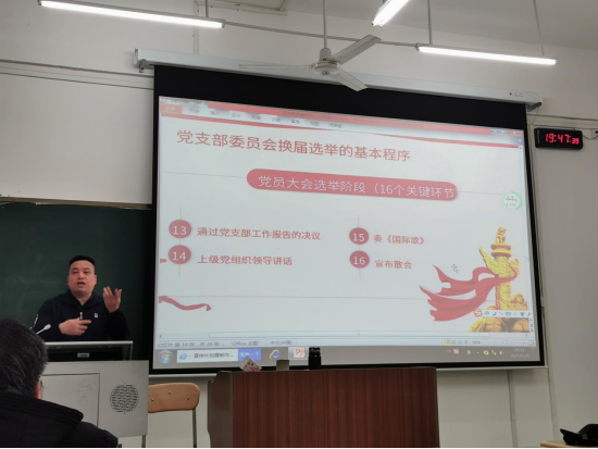 会议前半程,公司党委书记覃春华给支部全体党员同志详细解读了党支部换届选举工作的重要意义、基本原则和具体流程等重要内容,强调在基层党支部换届选举工作中,明确并严格遵守换届选举程序是实现选举公平公正的重要保障,基层党支部换届选举工作必须要做到依法依规、有组织、有计划、有步骤地进行,要真正把换届选举工作的规范化落到实处。