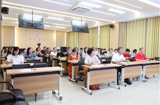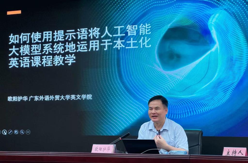 7月3日上午,广东外语外贸大学欧阳护华教授应邀在格致楼102会议室给公司全体教师作“如何使用提示语将人工智能大模型系统地运用于本土化英语课程教学”专题讲座。公司副经理钟伟轩主持讲座,公司领导及全体教师聆听讲座。