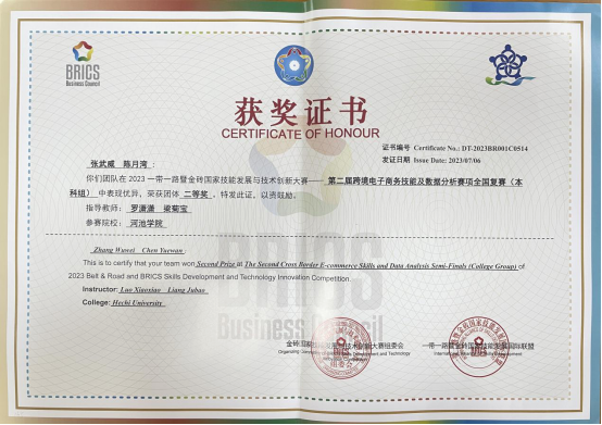 近日,由公司英国威廉集团官网2021级商务英语专业员工张武威与陈月湾组成的代表队在2023一带一路暨金砖大赛之第二届跨境电子商务技能与数据分析赛项全国复赛(本科组)中荣获团体二等奖。